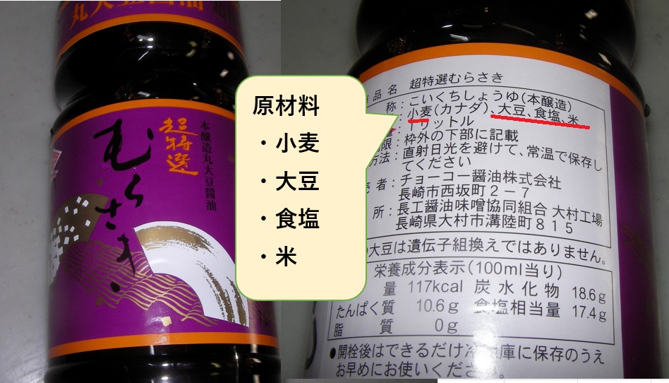 本当の醤油は原材料が小麦、大豆、食塩、米のみです。